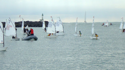 3 courses sont validés. Un 4° départ est donné, le vent monte enfin, Raf sent arriver son heure, il prend une autre option de course, et se place dans les 15 premiers de sa poule ! Timo est content de sa perf aussi - quand un zod passe à toute allure devant tous les optis, le drapeau "course annulée" flottant au vent. Vraiment dommage!